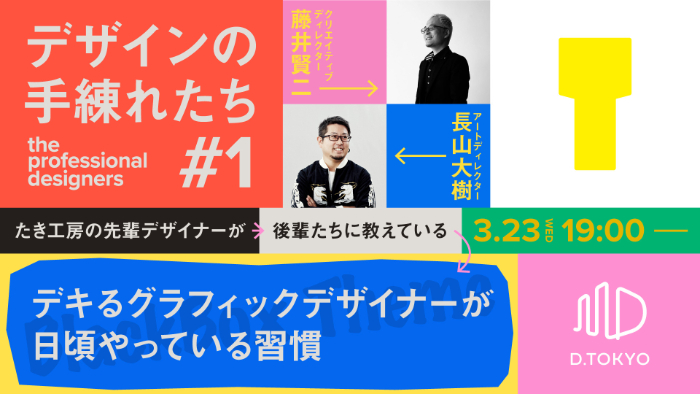 当社が運営する現役デザイナー向け能力開発クラス「D.TOKYO」でコーチを務める、株式会社たきコーポレーション 藤井賢二氏、同社 長山大樹氏をお招きし、グラフィックデザイナーとして培われてきたノウハウや日頃の習慣についてお話していただきます。