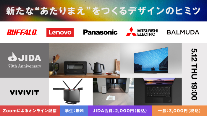 当イベントは、2022年で創立70周年を迎えるJIDAと当社の共催による学生向け記念セミナーです。ゲストスピーカーとして、株式会社バッファロー 青戸雅菜氏、レノボ・ジャパン合同会社 池上響氏、パナソニック株式会社 高橋岳人氏、三菱電機株式会社 古畑直樹氏、バルミューダ株式会社 松藤恭平氏をお招きし、手掛けた製品をベースとした各社のデザインワークについて発表していただきます。